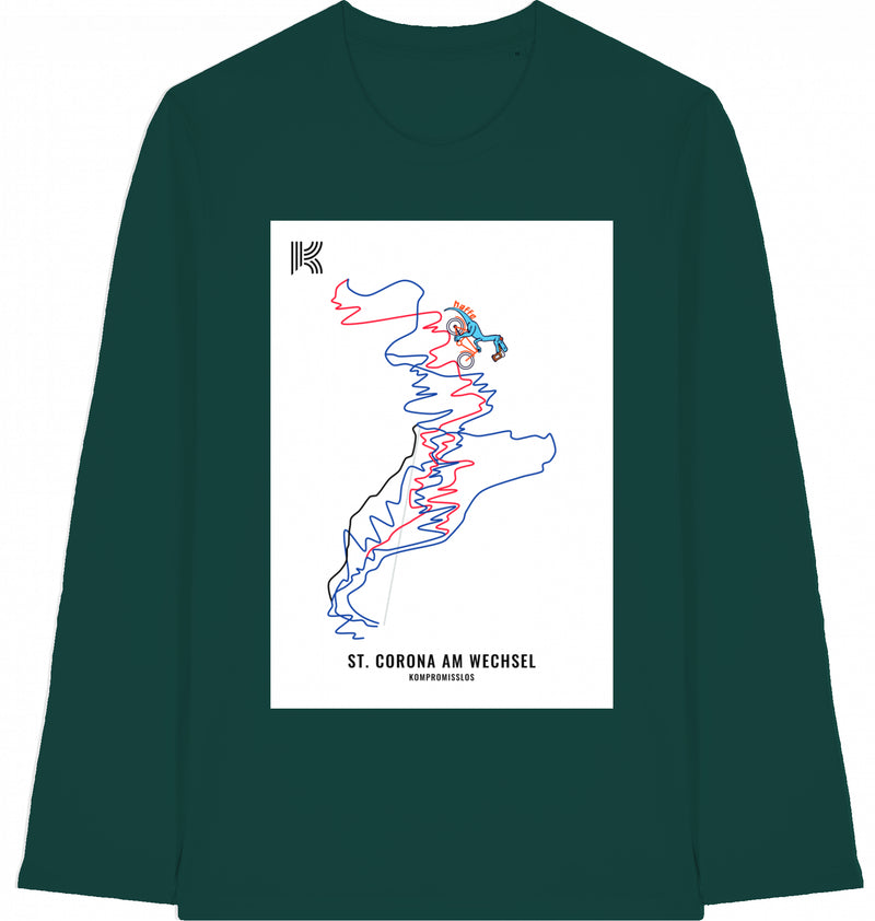 Unisex-Langarmshirt | Set-In-Ärmel | 1x1 Rippstrick am Halskragen | Doppelnaht-Steppstich an Ärmelbündchen und Saum | Innenliegendes Nackenband aus Eigenstoff